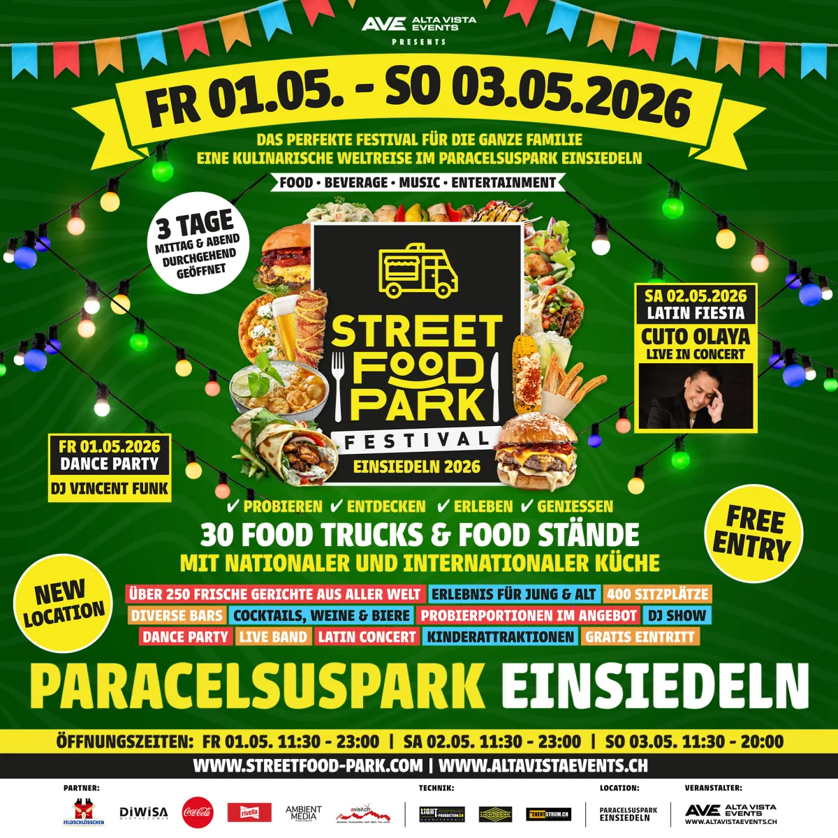 Das beliebte Street Food Park Festival kommt zum ersten Mal nach Einsiedeln und verwandelt den Paracelsuspark vom Freitag, 01. Mai (Tag der Arbeit) bis Sonntag, 03. Mai 2026 in ein Paradies für Street-Food-Fans! Unsere Street Food Künstler servieren euch eine riesige Auswahl an frisch zubereiteten Spezialitäten aus allen Kontinenten der Welt. DJs, Bands, Live-Acts und Hüpfburg sorgen für die passende Unterhaltung. Komm mit uns auf eine kulinarische Weltreise voller spannender Aromen, musikalischen Highlights und einer lebendigen Festivalstimmung für Jung & Alt.