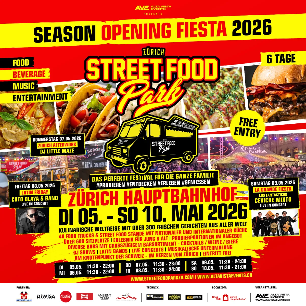 Der beliebte Zürich Street Food Park kehrt vom 05. bis 10. Mai 2026 mit seiner Season Opening Fiesta im Hauptbahnhof zurück und eröffnet die neue Street-Food-Saison mit einem Feuerwerk an kulinarischen & musikalischen Highlights! Unsere Street Food Künstler servieren euch eine riesige Auswahl an frisch zubereiteten Spezialitäten aus allen Kontinenten der Welt. DJs, Bands und Live-Acts sorgen für die passende Unterhaltung. Inmitten der Stadt feiern wir ein Fest der Aromen und Begegnungen. Komm mit uns auf eine kulinarische Weltreise am Knotenpunkt der Schweiz – im Herzen von Zürich.